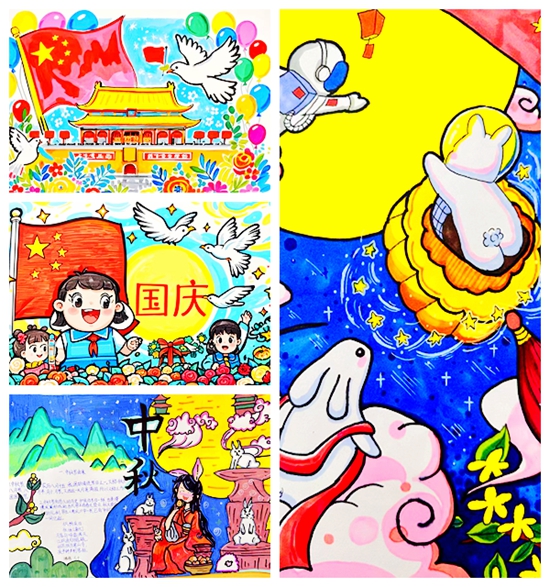 手抄报创作现场,学生们化身“小小设计师”,精心构思排版。有的以“中秋团圆”为核心,绘制家人围坐赏月、品尝月饼的温馨场景,摘抄“但愿人长久,千里共婵娟”等经典诗句;有的聚焦“国庆”主题,用时间轴呈现祖国发展变迁,搭配“我爱你中国”等醒目字样。“我收集了爷爷讲述的建国初期故事,把它写进手抄报里,想让大家知道今天的幸福生活来之不易。”四年级学生李雨桐捧着自己的作品,语气中满是骄傲,一张张手抄报既是创意的结晶,更是学生们家国情怀的生动表达。