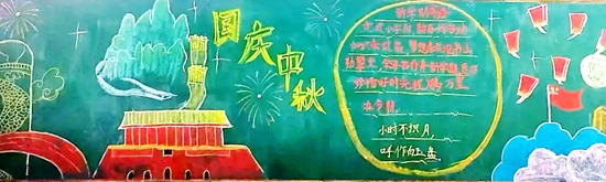 教室内部同样热闹非凡,一块块主题黑板报成为传递双节情感的重要载体。学生们发挥奇思妙想,用五彩画笔勾勒祖国壮丽山河,用文字记录新中国辉煌成就,嫦娥奔月的浪漫、天安门城楼的庄严、航天事业的突破等元素跃然黑板之上。“我和同桌花了两节课画这幅‘山河无恙’,就是想把对祖国的喜欢都画进去!”六年级学生王梓轩指着自己的作品,眼里满是激动与自豪,每一幅黑板报都成为教室里独特的“爱国文化角”。