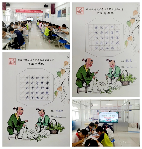 书写大赛现场则弥漫着浓郁墨香,学生们端坐在桌前,手握钢笔,一笔一划认真书写与双节相关的诗词、名言。“金秋迎国庆,四海共欢腾……”“华夏展宏图,山河美如画”等字句在笔下流淌,工整美观的汉字不仅展现出扎实的书写功底,更传递出对中华传统文化的热爱与对祖国的深情祝福。“写这些句子的时候,我好像能感受到革命先烈对如今盛世的欣慰,对我们的期许,坚定了自己学有所成,为祖国作出自己应有贡献的决心。”参与比赛的六年级三班学生刘尚宇掷地有声地说道。