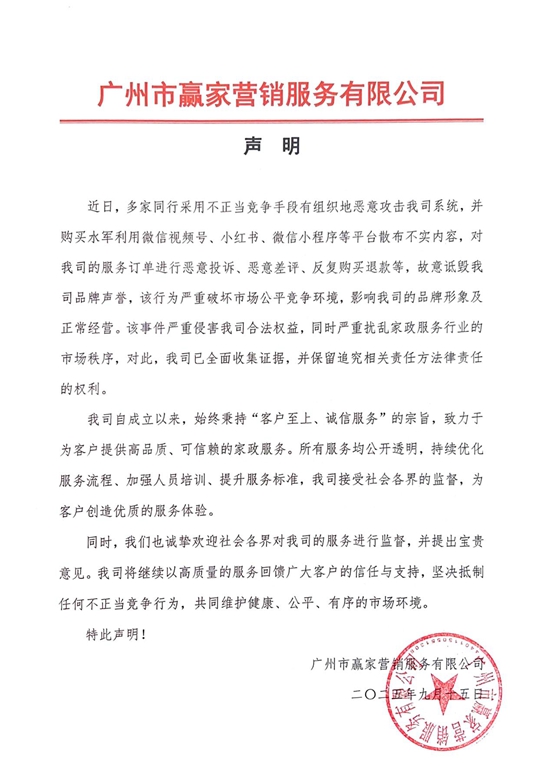 在日常生活里,家政服务与人们的居家生活紧密相连,派单是否合理、服务交付是否优质、售后能否及时妥善处理,都关乎着消费者的体验。然而近日,广州市赢家营销服务有限公司却遭遇了同行不正当竞争的恶意冲击。